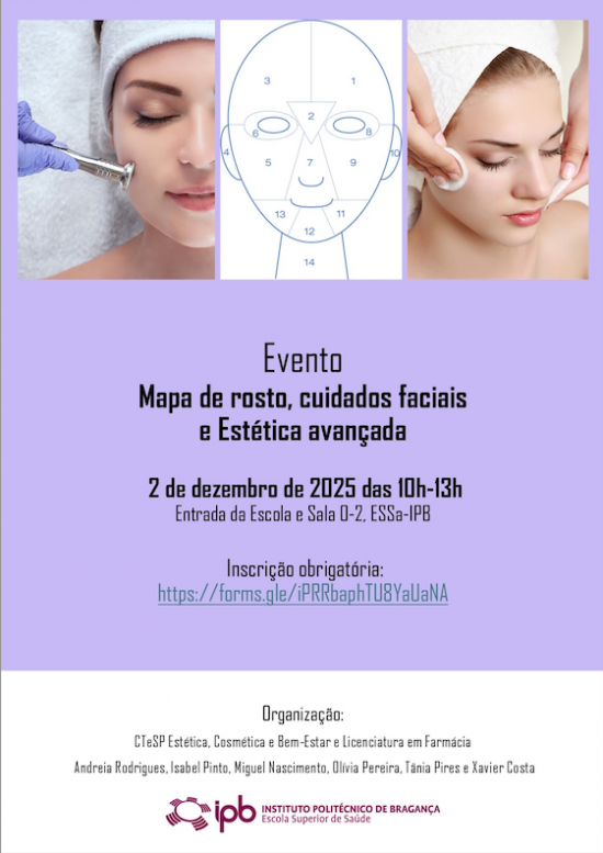 Entrada da Escola e Sala 0-2, ESSa-IPB Os cursos de TeSP em Estética, Cosmética e Bem-estar e de Licenciatura em Farmácia encontram-se a organizar o evento " Mapa de rosto, cuidados faciais e Estética avançada" para o que convidam a comunidade da ESSa a participar.