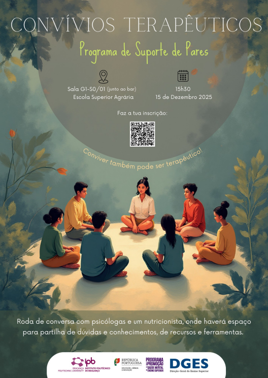 Os Convívios Terapêuticos são uma iniciativa do ProS2M_IPB, Programa para a Promoção de Saúde Mental no Ensino Superior, através do qual se ergue o Serviço de Saúde Mental e Bem-Estar (SSMBE) do Gabinete de Saúde do IPB. Este convívio será dinamizado pelas Psicólogas Ana Rita Noné e Vanessa Oliveira Bragada e pelo Nutricionista Wandryl Cândido.